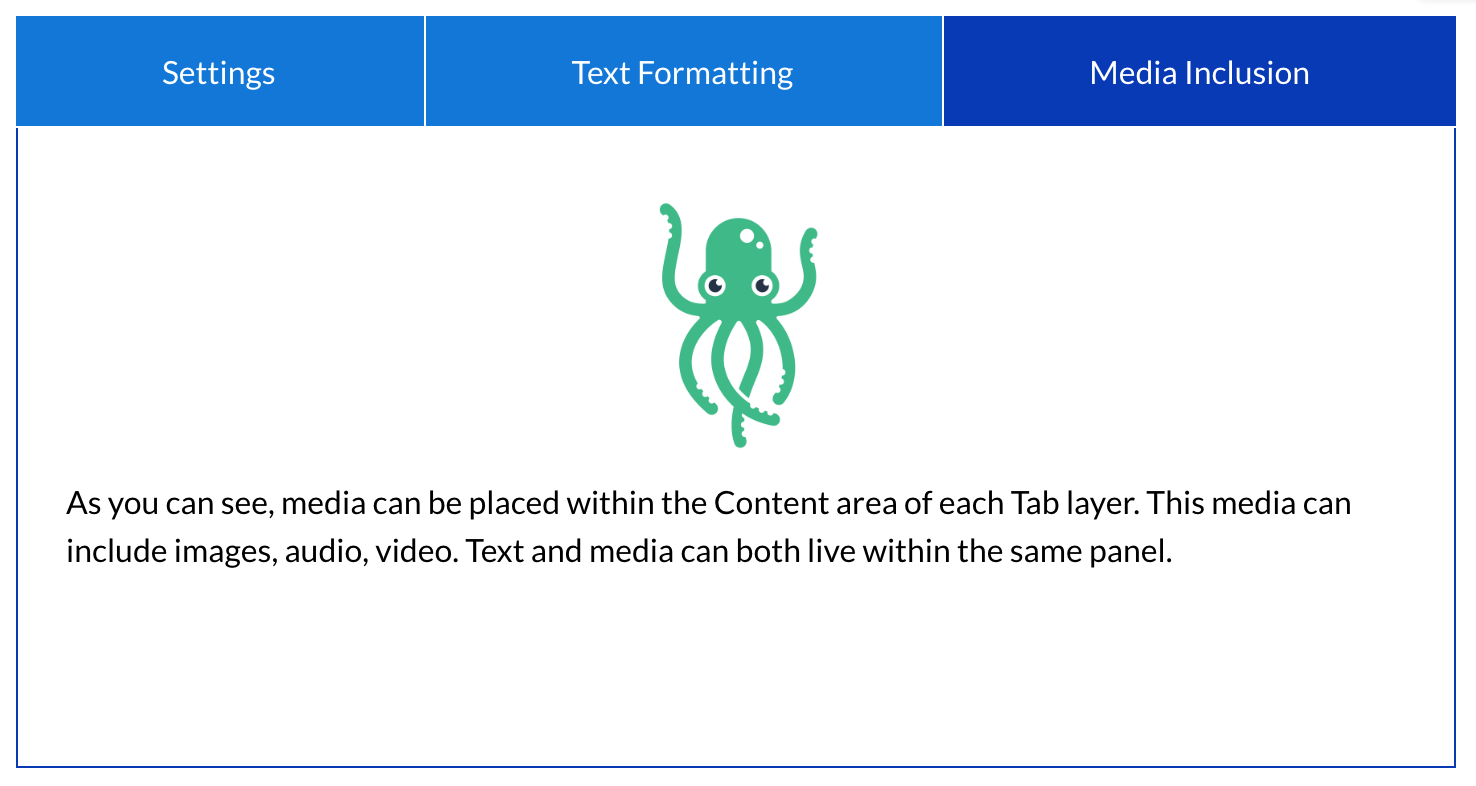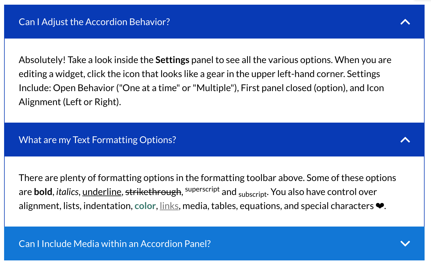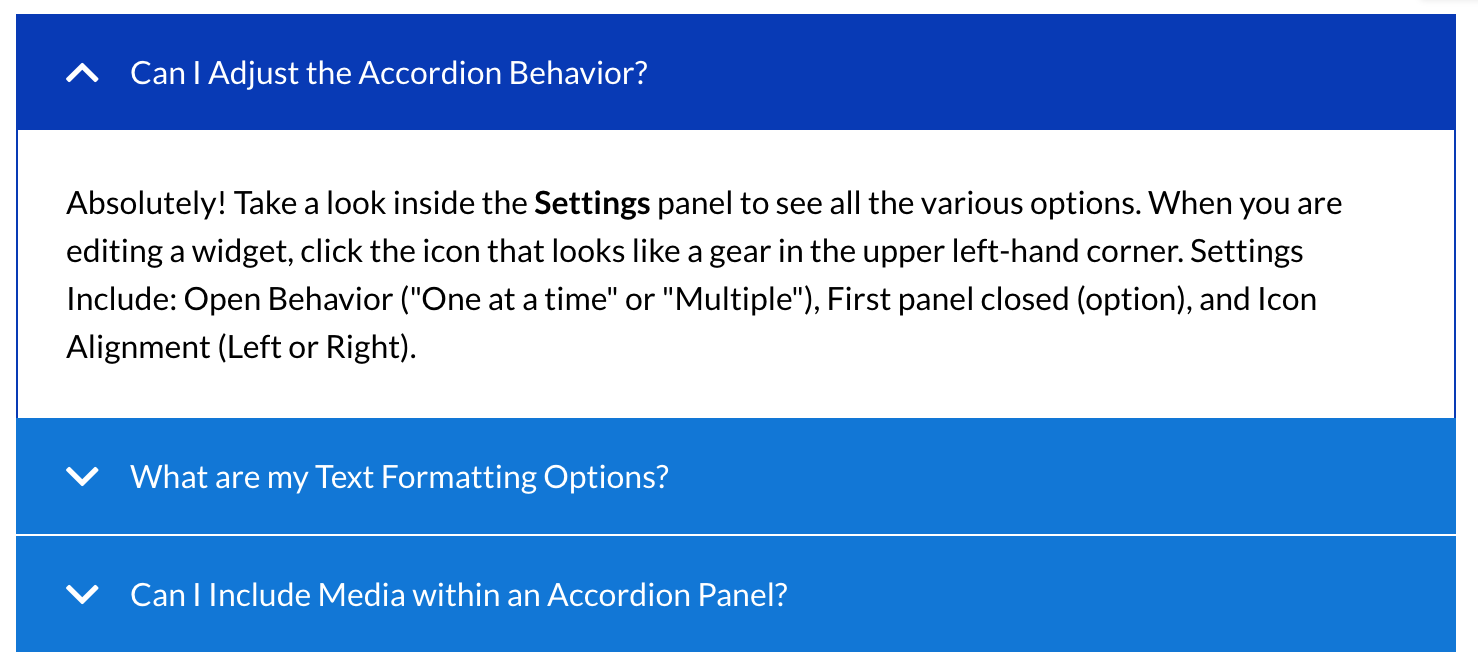 The two most popular display widget types for content that is largely text based are the Tabs widget and the Accordion widget. There are some critical visual distinctions between the two templates, as well as the important need to see all content in context that can only be achieved in the Accordion widget.