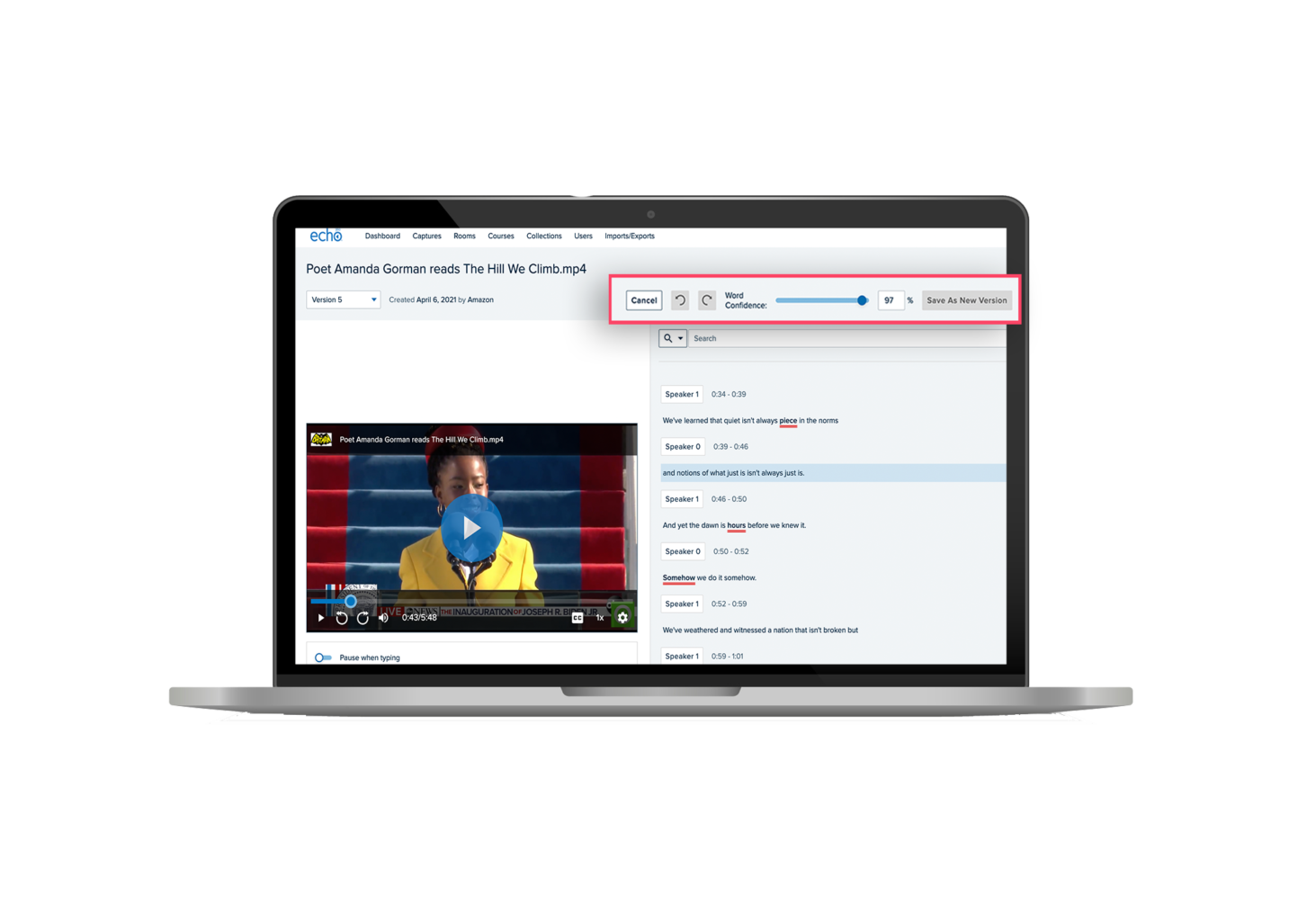 EchoVideo’s features make creating and importing videos into courses a one-click process. Echo360 capabilities include Automatic Speech Recognition to make a transcript of any video, with the transcript creating closed-captions and a searchable, editable index.