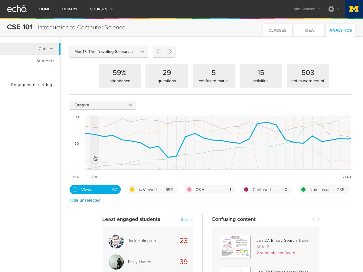 This is just one example of how learning analytics is transforming the modern classroom. Echo360 places a number of analytic tools at the fingertips of the instructors. First, instructors are given an intuitive dashboard that delivers insights into individual students and the class as a whole. Daily report cards show instructors which students are participating and what questions are being asked regularly, so they can find at-risk students.