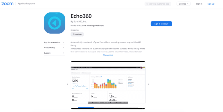 The Echo360 integration is available in the Zoom Marketplace and is easy to configure. If you are an Echo360 administrator, follow this step-by-step guide to integrate with Zoom. After the integration has been completed, instructors and students can use this guide to configure Zoom preferences to ensure a seamless transfer of recordings into the Echo360 library.
